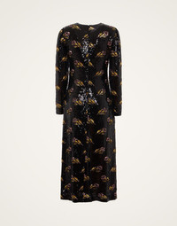 It’s the Long Sleeve Swing Dress you know and love, now in a more sensual, figure-hugging fit. With a curve-celebrating body that flares out at the hips into an ankle-grazing skirt, we crafted this beauty in party-ready embroidered pailletes with this majestic Mayfair print across her for extra opulence. Details & Fit - Embroidered pailletes - Long sleeves - Form fitting through hips - No pockets - 100% made in Italy - The model is 180 cm / 5′ 11″ tall and wears a size S
