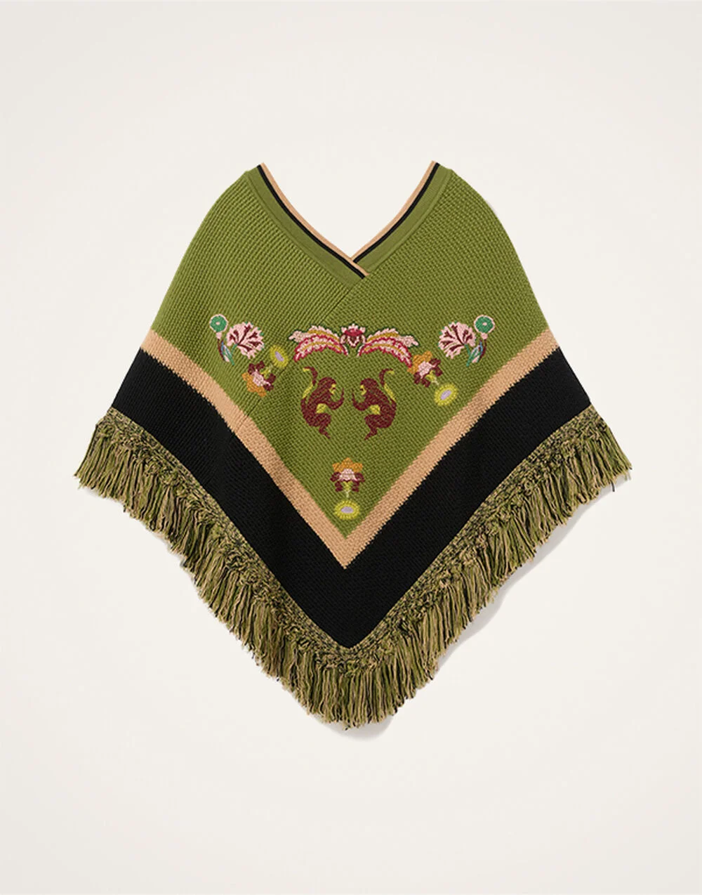 We like our clothes to tell a story. So imagine our delight upon dreaming up this delicious Dreamcatcher Poncho with it’s slightly cropped fit and fabulous fringe works beautifully as a top on its own but also layered over your floaty Cerere Dress at your sunset meditation practice. Details & Fit - Wool - Cropped poncho - Fringed Trims - Composition: 100% Wool - Made in Italy
