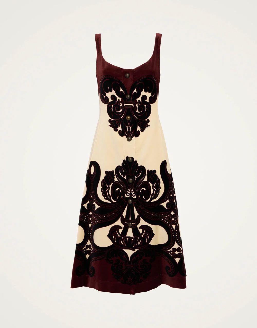 A little bit Sound of Music, a little bit Roman Holiday, the Ella Midi Dress is as high-vibe as she is versatile. Crafted in the most exquisite Italian velvet with a hand-placed Corsini-print inspired by the Renaissance, this empire-cut stunner is one of our all-season essentials, dazzling on its own with heels at a party and with just as much impact layered over a Poet Shirt during the day. Ella, ti amiamo. Details & Fit - Velvet midi dress - Hand-placed print - Nipped in waist - Square neck - No Pockets - Empire cut - 100% made in Italy - Composition: 96% Viscose 4% Elastane