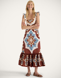 A maxi dress with maximalist impact, the Gingerbread dress was designed to go from pasticcini in the piazza to spritzes by the seaside. Cut from smooth Italian cotton with a hint of stretch, she has a cinched waist that flares out into a fluid skirt with a romantic tier. Equal parts laid-back ease and Lake Como luxury in one perfect day to night dress. It arrives in our hand-placed Palazzo print in delectable shades of chocolate and blue. Seriously, what could be sweeter? Details & Fit - Long cotton dress - Ruch sleeves - Cross back - Tiered skirt - Garment length: 110cm - 100% Made in Italy - Composition: 97% Cotton 3% Elastane - The model is 178 cm / 5′ 10″ tall and wears a size S