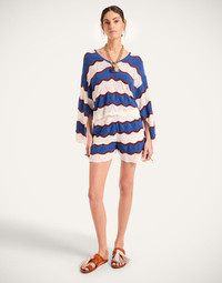 Crafted from our Italian lace knit, the Hang Ten Top is the perfect blend of luxurious and laid-back. Cosy enough for autumn on the Amalfi and breezy enough for winter oceanside getaways, this is the ideal item for throwing over your swimsuit after a dip to head straight to your aperitivo. Grab the matching mini shorts for a chic seaside set! Details & Fit - Lace knit top - Wave pattern - V neck - Wide short sleeves - Composition: 50% Cotton 46% Viscose 4% Metal Polyester - Made in Italy - The model is 177 cm tall and wears a size S