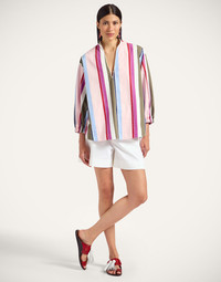 Oversized. Elegant. Effortless. The Jackie Top is everything you want in a sophisticated summer shirt. With a high-low hem and roomy back, she’s a throw on and glow kind of top, crafted in a light cotton in these sunshine deckchair stripes. Long enough to cover your bathing suit and chic enough for a night out in Portofino. Details & Fit - Long sleeved top - Slightly Oversized - Slightly sheer - Hits below bum - V neck - Voluminous sleeves with elasticated cuff - Garment length: 68cm - Made in Italy - Composition: 61% Cotton 39% Polyester - The model is 178 cm / 5′ 10″ tall and wears a size S