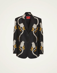 Inspired by the queen of cool, Grace Jones, this 1 1/2 breasted blazer hits on every note. Oversized but with a flow fit, she’s the perfect blend of masculine and majestic, as if you borrowed your date’s dinner jacket at the gala and draped it over your shoulders. Patch pockets on the front and faux buttons down the cuff add detail to an already dramatic look. We love her over dresses and jeans alike. Details & Fit - 1 1/2 breasted jacket - Oversized drapey fit - Patch pockets in front - Faux buttons on cuff - 100% made in Italy - Composition: 76%wool 24% polyamide - The model is 178 cm / 5′ 10″ tall and wears a size S