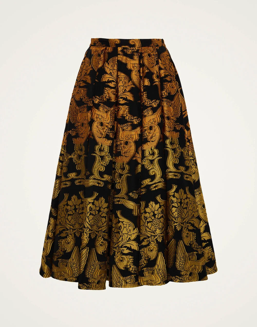 There’s something about a pleated skirt - it’s romantic, it’s sweet, it’s sophisticated, it’s chic. This version’s trapeze shape means gives her magic movement as you wander from the office to cocktail hour and, crafted in our shimmery fil coupe in this Renaissance-inspired Cherubs print, she adds a little dazzle to your everyday dressing. We love her with the Kelly Jacket as a suit but she’s just as sweet under an oversized Boy Sweater or French Toast Cardigan. Details & Fit - Pleated skirt - Hits just below knee - Printed fil coupe - 100% made in Italy - Composition: 59%Acetate 20%Cotton 12%Polyester