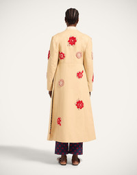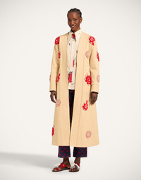 Channel your inner 80s icon with the Kintsugi Coat, a long-line masterpiece designed for drama. Featuring a commanding strong shoulder and a unique kimono-inspired front – no collar or lapel, just a beautifully stitched border – this cotton gabardine coat commands attention. Cinch it at the waist with its matching D-ring belt to create a powerful A-line silhouette, all brought to life with exquisite embroidery. This is more than a coat; it’s a statement. Details & Fit - Garment Fit: Regular - Cotton gabardine - Embroidered - 100% Cotton - Fully lined - Made in Italy - Garment length: 125cm - The model is 178 cm / 5′ 10″ tall and wears a size S
