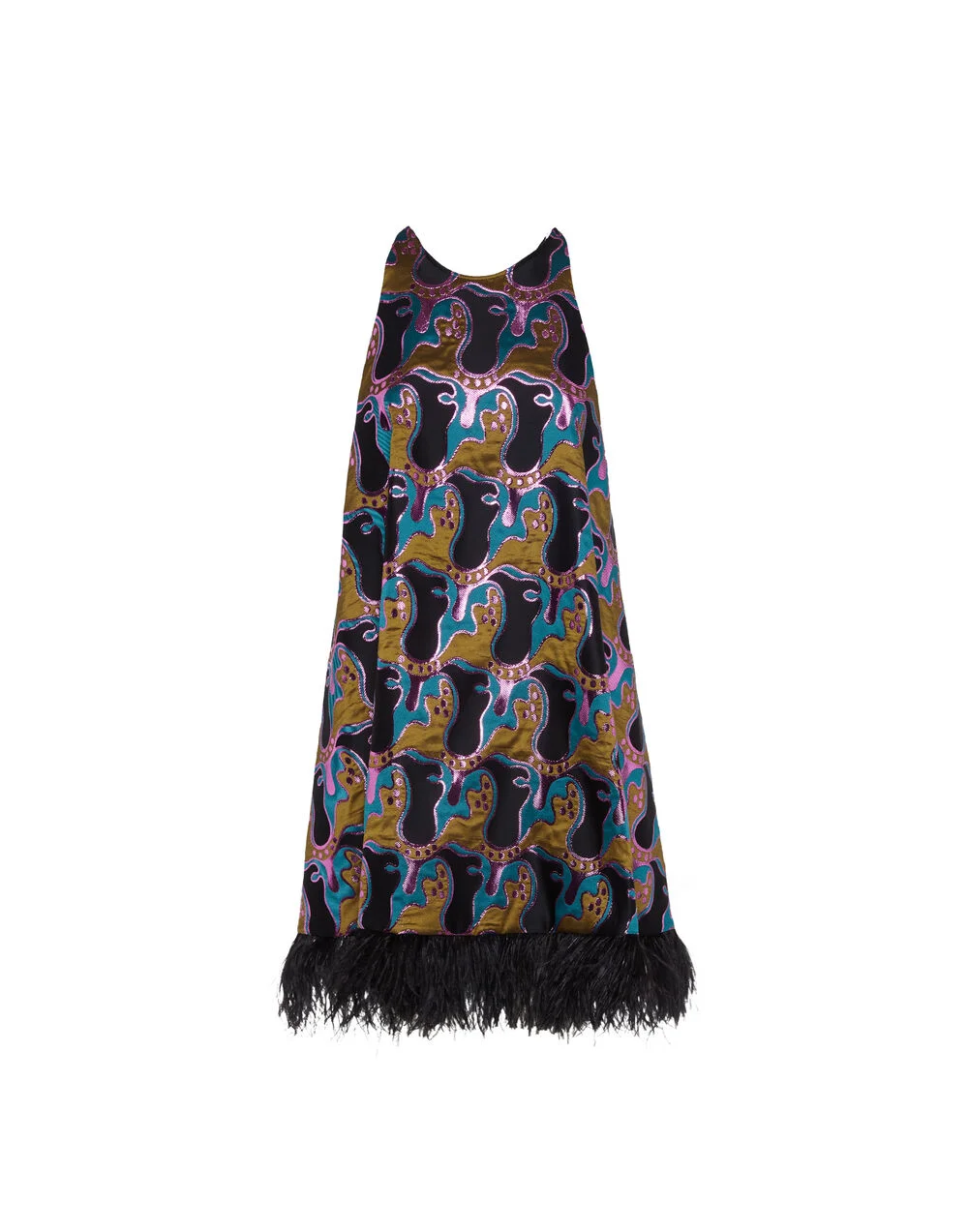 La Fenice means “The Phoenix” in Italian, and this strong shoulder celebrating dress certainly lives up to its high-vibe name, cut in faille and sumptuous jacquards with a feather-trim for added festive glamour. Lined with pockets, she looks dazzling on long-legged and shorter sisters alike, belted or unbelted, no matter your shape. Fore-warning, amore, La Feniche is not for the wallflower - you’re destined to turn heads in this one. Details & Fit - Short, sleeveless dress - Jacquard - Lined - Pockets - Zipper in back - Feather trimmed hem - Made in Italy - Composition: 52% Polyester 37% Recycled Polyester 9%Metal 2% Ostrich Feathers - The model is 179 cm tall and wears a size S - Garment length: 75cm