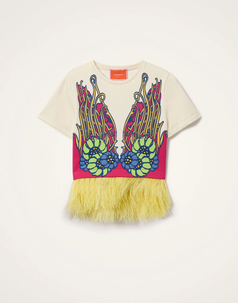 Our favorite high-low tee reimagined in light but structured double jersey to exude dreamy vacation ease wherever you are in the world. With detailed finishing, it features a cool, cropped T-shirt silhouette that leans into a boxy, boyish vibe and a fabulously feathered hem. Belissima and breezy with the matching Loose Pants or weekend-ready worn with your favorite jeans. Details & Fit - Jersey with feathers - Round neck - Cropped silhouette - 100% Made in Italy - Garment length: 50cm - Composition: 98% Cotton 2% Ostrich Feathers - The model is 177 cm tall and wears a size S
