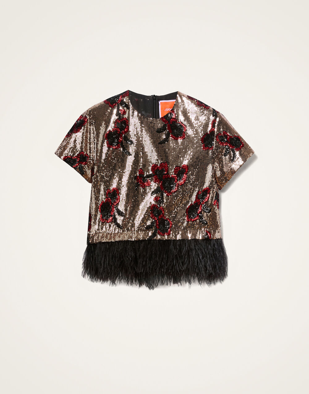 How to add a little drama to the everyday? Allow our La Scala T-shirt to take to the stage. This head-turner arrives in a cool, cropped T-shirt silhouette strewn with shimmering paillettes in this punchy Primrose motif. Oh, and did we mention it has an ostrich feather trim? No maximalist would save this babe for best so we’d recommend throwing her on with the Hendrix Pants or your favorite wide-legs for a look that could take you from work to weekends or winter weddings, and enjoy all the compliments that ensue. Details & Fit - Paillettes - Round neck - Cropped silhouette - Ostrich feather trim - 100% Made in Italy - Composition: 100% Polyester - The model is 180 cm / 5′ 11″ tall and wears a size S