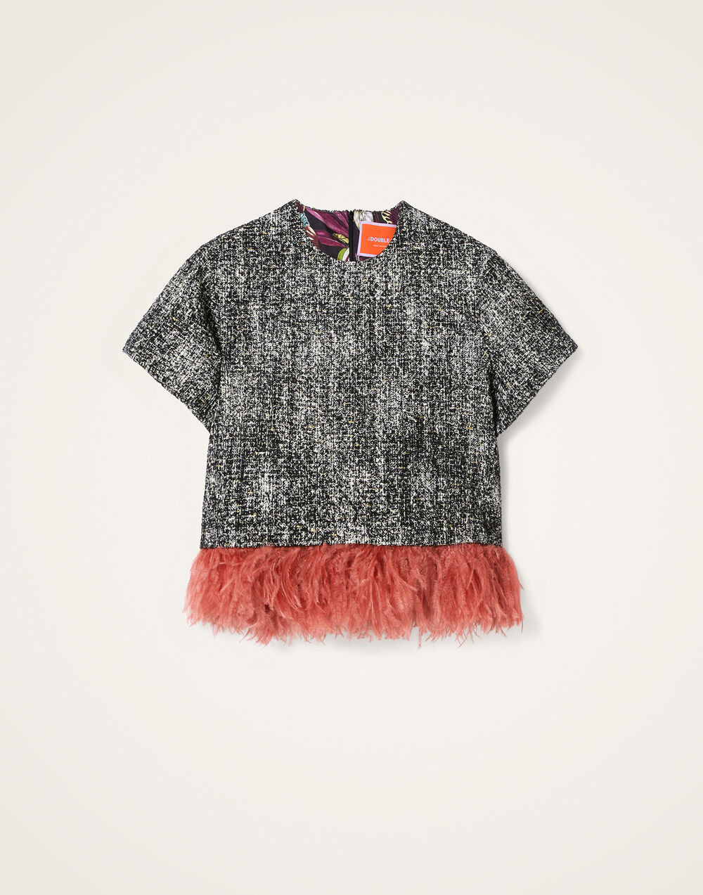 How to add a little drama to the everyday? Allow our La Scala T-shirt to take to the stage. This beauty follows its predecessors with a fabulous contrast ostrich feather trim, balanced with a cool, cropped T-shirt silhouette crafted for winter in our ultra chic tweed lurex. Structured not weighty, boyish and boxy, dress it up with snappy black tailored pants and feathered mules, or down with your favorite pair of jeans. We love a little high-low. Details & Fit - Tweed lurex - Round neck - Cropped silhouette - Ostrich feather trim - 100% Made in Italy - Composition: 31% Viscose 26% Cotton 19% Acrylic 9% Polyamide 4% Other Fibers 4% Polyester 4% Mohair 3% Virgin Wool - The model is 180 cm / 5′ 11″ tall and wears a size S