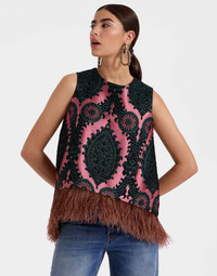 As far as interesting silhouettes go; this top may win the gold star. The asymmetrical hem, trapeze silhouette and contrast macrame tassels creates an alluring form. In sumptuous jacquard which has a textured surface feel, it’s undoubtedly upscale with it's feathered hem, but looks equally as great with some jeans and flats. Details & Fit - Jacquard - Unlined - Sleeveless top - Tassels along bottom hem - Composition: 42% Polyester 37% Cotton 9% Metal 7% Silk 5% Polyamide - The model is 179 cm / 5′ 10.5″ tall and wears a size S