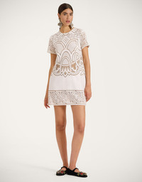 This playful T-shirt dress is all grown up crafted in our dreamy cotton lace for its most romantic moment yet. Swinging shy of the knee, its airy A-line silhouette not only flatters sisters of all shapes and sizes, but is endlessly versatile whether you're palazzo-hopping in Palermo or beach-club basking in Forte dei Marmi this season. Oh, and we’ve left it unlined to highlight all those gorgeous embroidered details. Play up the romance in strappy sandals and wear with a bralette underneath, or nothing at all. Details & Fit - Embroidered cotton lace - Slim in the shoulders, generous in the hips - Classic T-shirt silhouette - Falls into an A-line - Mini length - Concealed back zipper - 100% Made in Italy - Composition: 80% Cotton 20% Polyester - The model is 178 cm tall and wears a size S - Garment length: 80cm