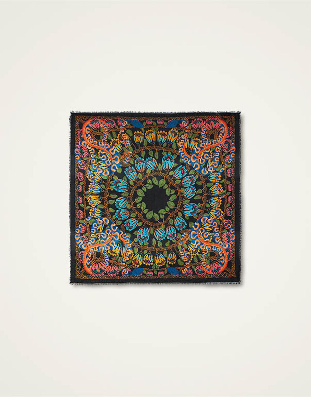 It wouldn't be dolce vita meets bohemia without a fabulously fashion forward foulard now would it? The ultimate Italian accessory for any It girl, this piece is the oldest trick in the Milanese Sciura style book, always stashed in a handbag to be folded around the hair, wrapped loosely into a crisp shirt collar, or tied onto a wrist, or ponytail. Take a cue from Estelle Pigault or Chiara Totire - who crafted this capsule with us - and tie this cashmere blend stunner loosely around the neck or bag strap for instant "Parisienne-in-Puglia" cool. Details & Fit - Modal and Cashmere blend - Estelle and Chiara "Eden" capsule - Frayed fringe edge - Placed print - Composition: 90% Modal 10% Cashmere - Made in Italy - Measures 120 x 120cm