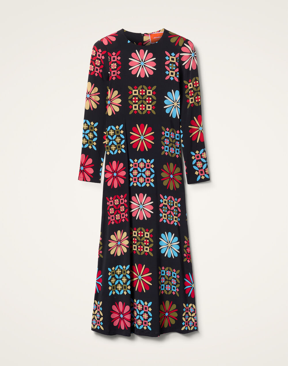 It's the Swing Dress you know and love, but with long sleeves, babe! This design twist on our very first La DoubleJ dress provides a very practical update for our best-seller. We've designed it in this fun-loving Vetrata Grande print and cut it in sable to give a little stretch and make it a bonafide day-to-night number. Details & Fit - Sable - Slim in the shoulders, generous in the hips - Long sleeves - Falls into an A-line - Hits just above the ankles - Hidden side slit pockets - Concealed back zipper - 100% Made in Italy - Composition: 96% Viscose 4% Elastane - The model is 177 cm tall and wears a size S - Garment length: 135cm