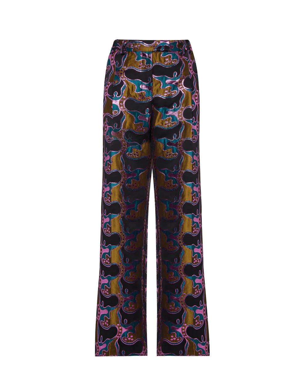 For when you need to head straight from the boardroom to the Lake Como birthday bash, these pants. Are. IT. Equal parts laid-back and luxurious, the Loose Pant has a tailored, masculine feel, with pleats down the front, a low waist and a whimsical wide leg. With belt loops and pockets in the front and back, these are both utilitarian and seriously stylish, the perfect partner for any of our bellissima Boy Shirts or a basic white tee for off-duty allure. Details & Fit - Wide leg pant - Belt loops - Pockets in front and back - Pleated front - Low waist - Shimmery jacquard - Made in Italy - Composition: 54% Polyester 37% Recycled Polyester 9%Metal - The model is 179 cm tall and wears a size S - Garment length: 110cm