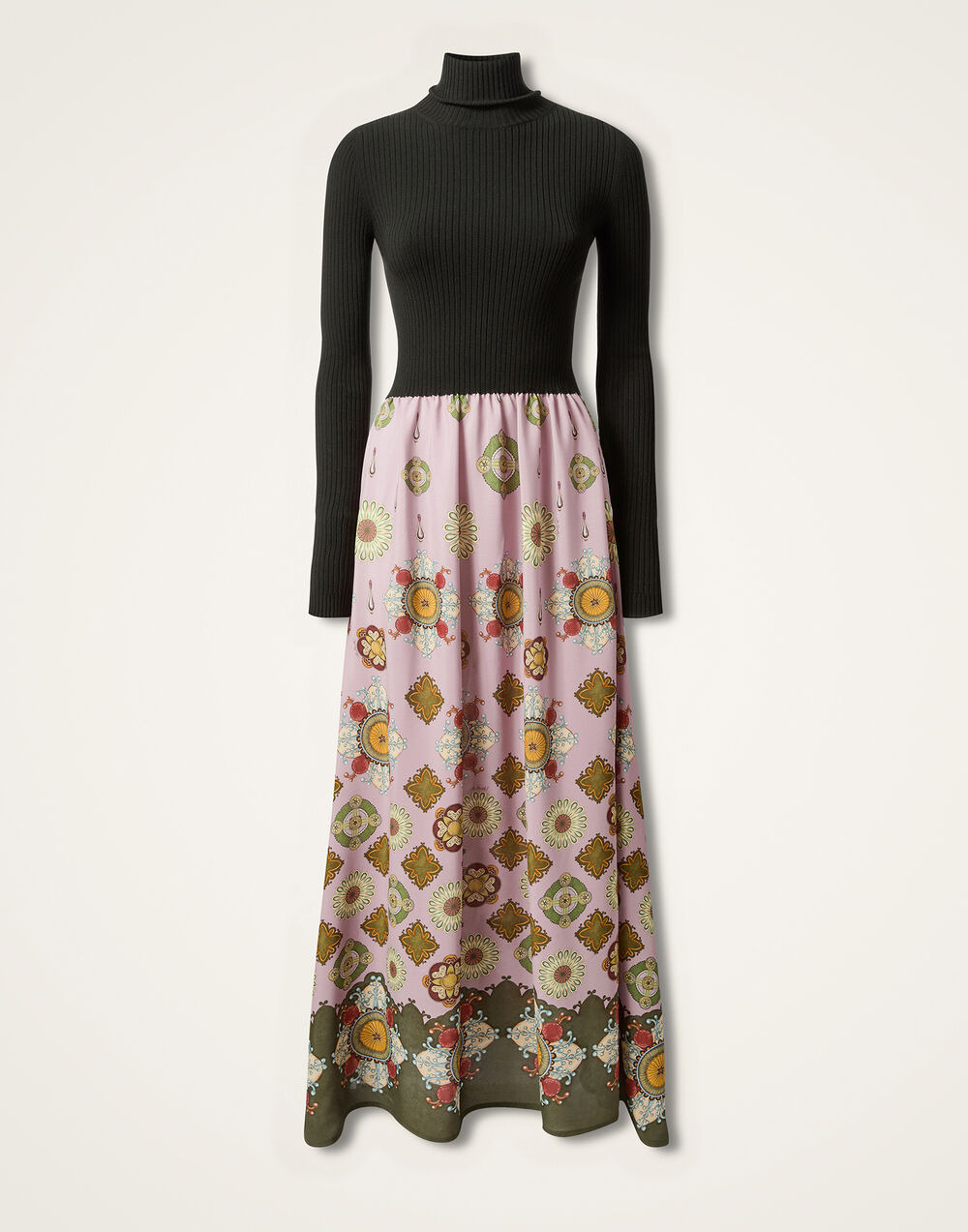 We're calling it - the Lunaria Foulard Knit Dress just might be the dress of the season. With a figure-skimming turtleneck style top that flows out into a sheer skirt in our Nucleus print, she's the perfect blend of laid-back and luxurious, romantic and dramatic, sensual and sophisticated. It's the autumn-to-spring dress that dreams are made of and we all want one! Details & Fit - Turtleneck style top - Long sleeve - No pockets - Made in Italy - Composition: 70% Viscose 30% Polyester - The model is 177 cm / 5′ 9.7″ tall and wears a size S