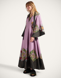 Shouldn't every babe have a dress called the Magnifico hanging in her closet? La DoubleJ believes so! With a stand-up collar, long sash at the back and draped waterfall sleeves, this special number will glide you around the room with an ease and an elegance reserved for the most exclusive of occasions. Cut in our Como-made silk twill with a subtle sheen, it is hand-placed in our Nucleus print which captures that oh-so-elusive spirit of Milanese refinement. Prego! Details & Fit - Silk twill - Hand-placed print - Stand-up collar - Back sash at neck - Maxi length - Waterfall sleeves - 100% Made in Italy - Composition: 100% Silk - The model is 180 cm / 5′ 11″ tall and wears a size S