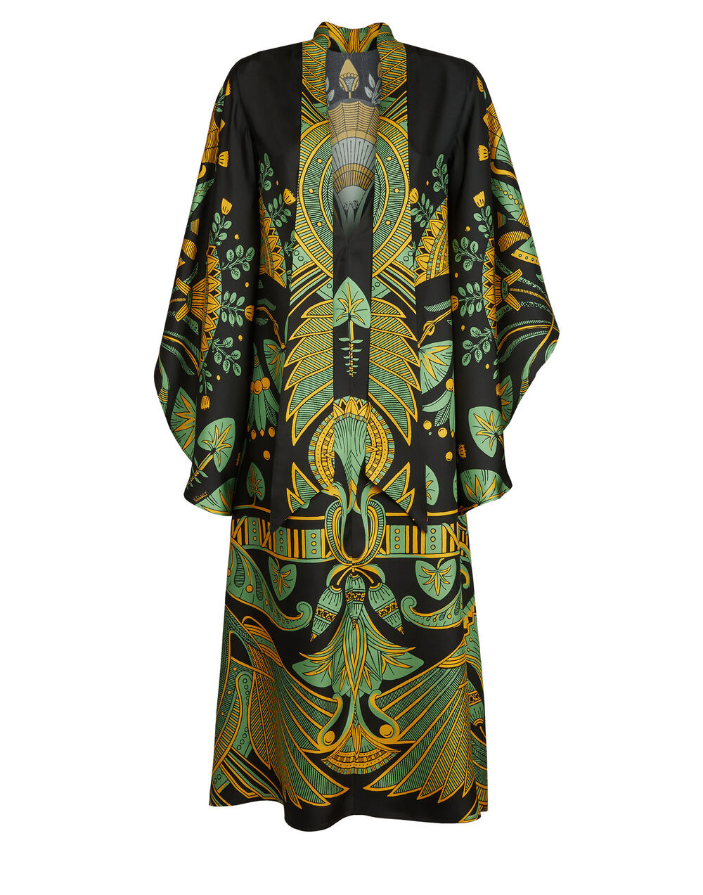 The Magnifico Dress you all know and stun in, but cut with a shorter midi hemline to bring more opulence to your day-to-night wardrobe. Like its sister it features a stand-up collar, long sash at the back and draped waterfall sleeves, and is cut in our luscious silk twill which has a subtle weave and sheen. Inspired by J.J.’s journeys through Egypt, this Nile motif is made all the more captivating, printed by hand to fall perfectly every time. Do as she does and reverse it for an equally beguiling look! Details & Fit - Silk twill - Midi hemline - Waterfall sleeves - Stand-up collar - Long sash at the back - Reversible - 100% Made in Italy - Composition: 100% Silk - The model is 180 cm tall and wears a size S - Garment length: 130cm