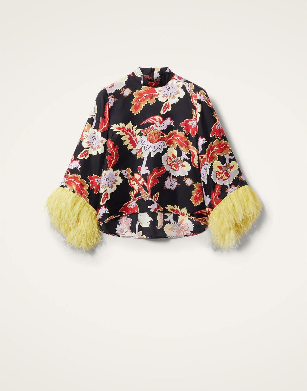 If a top could be a tease, this one would be it. Deceptively demure in the front with a high neck and easy A-line shape through the body, it’s the back of this beauty that truly wows, with a cape-like high-low back that floats as you turn. This silk twill iteration with feather-dipped sleeves has date night drama written all over it. Throw it under a gilet or our Folk Jacket for bohemian flare, or with our Milano Skirt for a super chic silhouette. Details & Fit - Silk - Feathers on the sleeves - High neck - A-line shape body - Shorter in front, longer in the back - 100% Made in Italy - Composition: 98% Silk 2% Ostrich Feathers - The model is 180 cm / 5′ 11″ tall and wears a size S