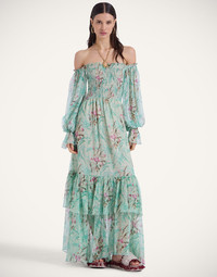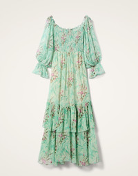 Made for the woman who wants to make a major impact, but look like they didn’t try at all, the Mayflower Dress is our elevated take on a classic bohemian shape. With intricate pinto smocking all along the the bodice that flows out into voluminous sleeves and a billowy tiered skirt, this outfit delivers serious shapes, sis. Wear her on or off the shoulder depending on your level of flirt. Details & Fit - Crepe de chine - Elasticated neckline - Smocked bodice - Two tiered skirt - Pockets - Sleeves with elasticated cuff - 100% Made in Italy - Composition: 100% silk - The model is 180 cm / 5′ 11″ tall and wears a size S