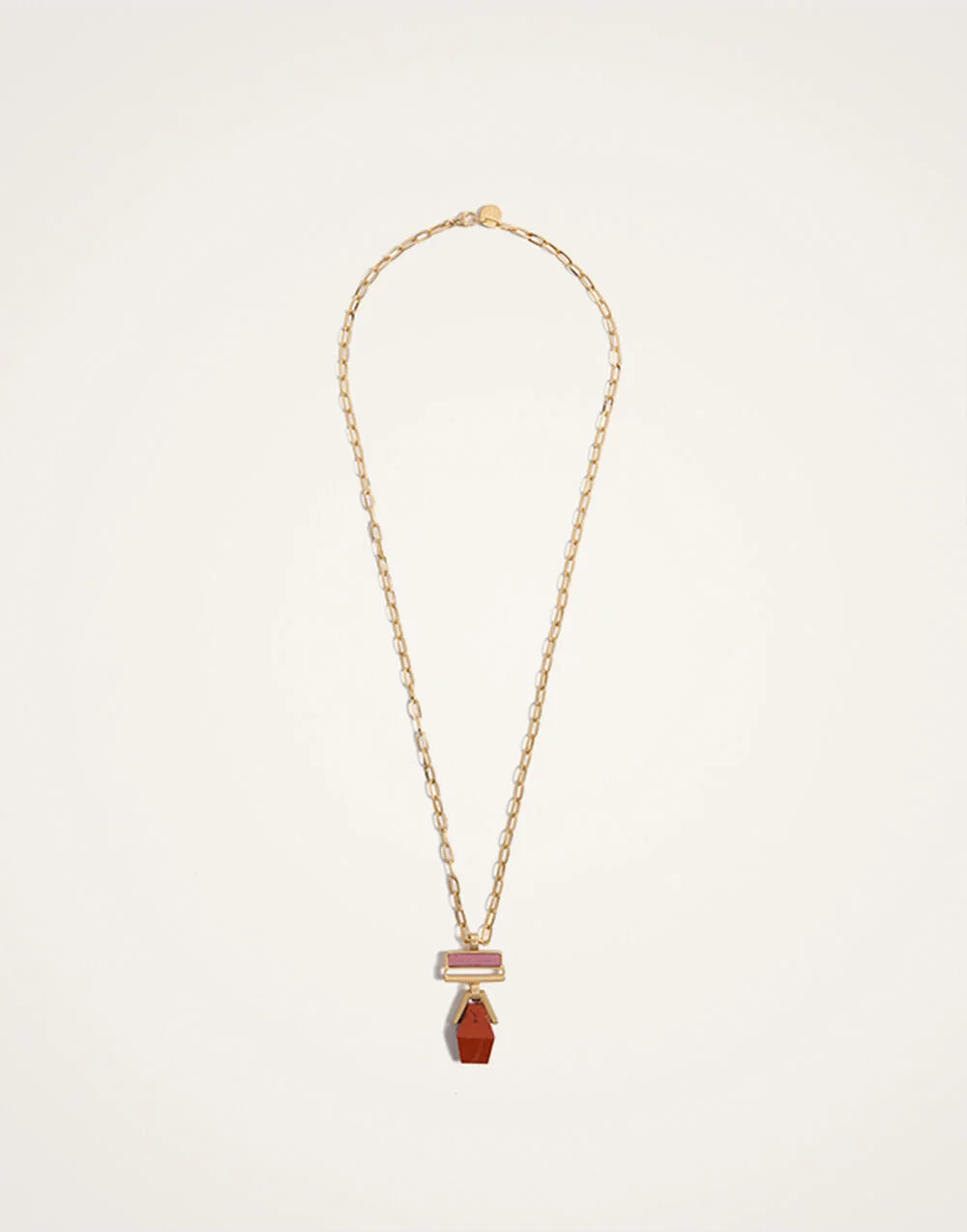 We've doubled up the extraordinary energy of this accessory with red jade, a precious stone that blocks negative energies, and Thulite, which is said to radiate love and enhance compassion. Beautiful layered with their big sister Portal Necklaces, this design dazzles with items from your own accessory archive. Details & Fit - 24K Gold Plated Brass and Red Jasper - Portal Pendant necklace - Adjustable Dainty Chain is 78.5cm - Composition:60% Brass 25% Red Jasper 15% Thulite
