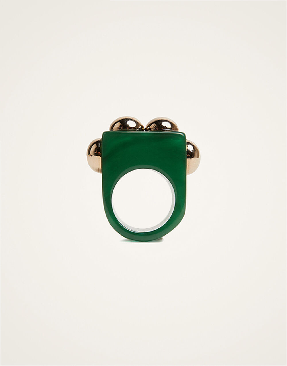 An iconic symbol of beauty and feminine power, we couldn’t think of a more fitting inspiration than the ancient Egyptian goddess Nefertiti when designing this statement jewelry piece. Crafted from solid colored resin, this oversized ring features gold studs across its rectangular band, which catch the light with every elaborate Italian gesture. Don't throw these around, amore - these delicate delights are precious. Details & Fit - Chunky rectangular ring - Colored resin with gold studs - Size "S" 17mm diameter - Size "M" 19mm diameter - Composition: 90% Resin, 10% Zamak - Made in Italy