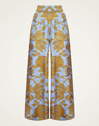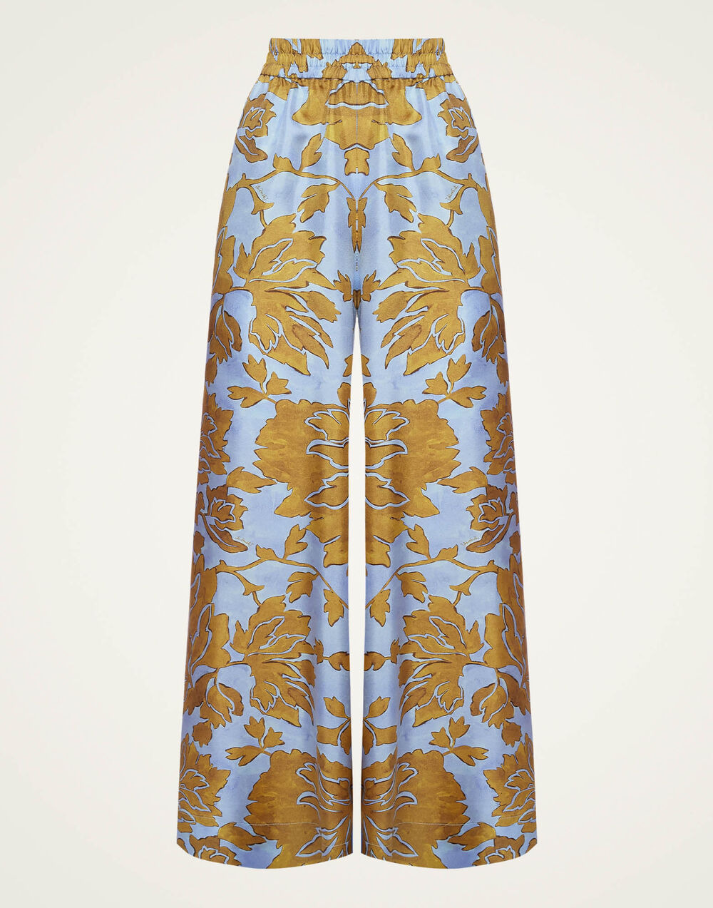 We cannot take credit for inventing the Palazzo Pant silhouette, but we will take credit for making them cool again. These trousers sit on the waist and fall flared, with a wide, breezy fit through the legs – like a skirt, but with the comfort of pants. A bellissima wardrobe addition in this chic and timeless Fan print. Details & Fit - Silk twill - Elastic waist - Concealed side pockets - Roomy fit - 100% Made in Italy - Composition: 100% Silk - The model is 177 cm tall and wears a size S - Garment length: 110cm