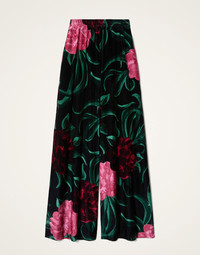 We cannot take credit for inventing the Palazzo Pant silhouette, but we will take credit for making them cool again. These trousers sit on the waist and fall flared, with a wide, breezy fit through the legs – like a skirt, but with the comfort of pants. In sumptuous stretchy velvet strewn with our bold Peony print they are as striking for day as they are sultry for night. Details & Fit - Velvet stretch - Elasticated waist - Concealed side pockets - Wide cut - Made in Italy - Composition: 85% Polyamide 15% Elastane - Garment length: 110cm - The model is 180 cm / 5′ 11″ tall and wears a size S