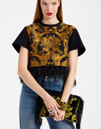 Didn't think our pochettes could get more perfect? Think again. We took this best-selling baguette with her sleek subtle side handle, crafted in Italian Jacquard and dipped her with feathers for even more fabulousness. The perfect size for your phone, your iPad, your wallet, and any extra phone numbers you'll no doubt pick up at the party. Details & Fit - Jacquard with feathers - Side handle - Zipper - Measurement: 32cm x 23cm - 100% Made in Italy - Composition: 34%Viscose 23%Cotton 22%Recycled Polyester 21%Polyester