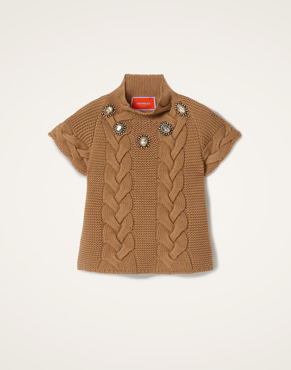Just like our Portrait Sweater, this knit kit essential has chic, chunky braids down the front and across the shoulder, but this time with short sleeves and a romantic high neck. Made in a chunky merino mix with small slits at the side hem to give her a more waisted effect. Molto Milanese in elegant brown, we love it with jeans or over our La Favorita slip dress. Details & Fit - Form fitting knit top - Short sleeve - Chunky braids down front and on shoulder - 100% Made in Italy - Composition: 40%Wool 25%Viscose 25% Polyamide 10%Cashmere - The model is 180 cm / 5′ 11″ tall and wears a size S