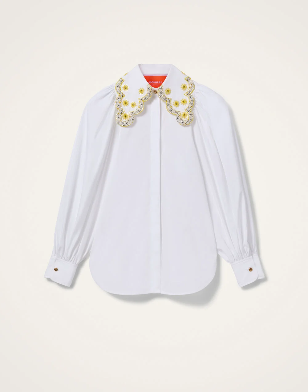 We’ve redefined classic shirting with the Pouf Shirt, a button-down beauty that brings a little high vibe volume to your wardrobe. Its playful sleeves transform a timeless silhouette into a statement piece, perfect for adding a touch of romantic drama to your everyday or dressing up for a chic occasion. And this intricately embroidered version in classic white? Timeless, amore. Details & Fit - Garment fit: fitted - Cotton popeline - Puffy Sleeves - Embroidered detachable collar - Scarab buttons - 100% Cotton - Unlined - Made in Italy - Perfect for layering - From day to night