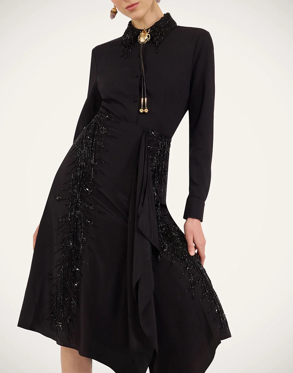 Featuring a powerful Peacock embroidery (a symbol of confidence and divinity) the Scarf Skirt is a seriously bohemian beauty with an asymmetrical hem that floats as you move. Pair it with your favorite boots and an oversized sweater for an It-Girl day look, or with one of our Scarf Tops for full-on foulard fabulousness. Details & Fit - Embroidered skirt - asymmetrical hem - Composition: 50% Viscose 35% Acrylic 10% Glass Beads 5% Polyester - Made in India - The model is 180 cm / 5′ 11″ tall and wears a size S