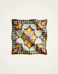 The ultimate Italian accessory for any It girl, this piece is the oldest trick in the Milanese Sciura style book, always stashed in a handbag to be folded around the hair, wrapped loosely into a crisp shirt collar, or tied onto a wrist, or ponytail. Adorned with our stunning hand-placed prints and crafted in a light silk-blend mix. Take a cue from the Italians and tie this beauty loosely around the neck or bag strap for instant "Parisienne-in-Puglia" cool. Details & Fit - Modal Silk blend - Frayed fringe edge - Placed print - Composition: 85% Modal 15% silk - Made in Italy - Measures 140 x 140cm