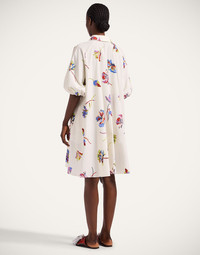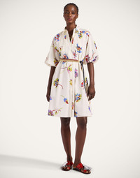 This is the dress we imagine the fairies in a Midsummer Night’s Dream might wear; floaty, fresh, and a little bit flirtatious. A blend of sophistication and sweetness, The Sunburst Dress has a refined buttoned collar that flows into a waterfall of soft pleats that waft as you walk, and elasticated sleeves that can be pushed up for extra volume. Beautiful on petite ladies and those looking to flatter a softer shape, she hits around mid thigh and transitions easily to fall thrown over tights and booties. Details & Fit - Summer Poplin - Button collar with stitching down the front - Elasticated sleeves - Mid-thigh hem - A-line shape - Soft pleating throughout body - 100% Made in Italy - Composition: 100% Cotton - The model is 178 cm / 5′ 10″ tall and wears a size S
