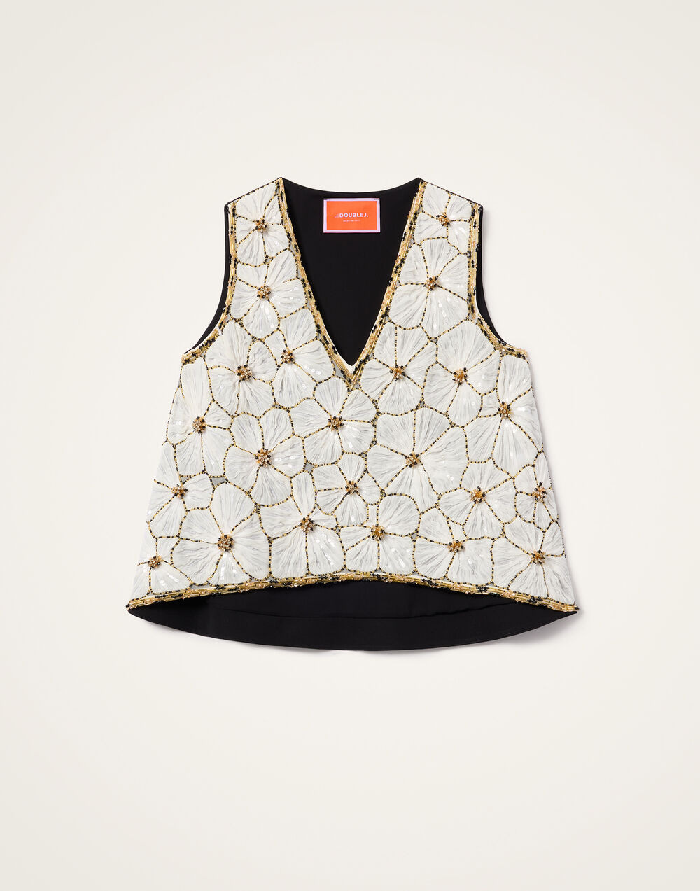 If you’ve been with us for a while you know (and, if you’re smart, likely own) the La Scala Top. We’ve reimagined this beloved La DoubleJ shape with a classic V neck version in a chicissima linen-silk-organza blend embroidered with crystals. It’s wide trapeze hem makes it perfect for layering over turtlenecks in the fall but we love it alone with a long skirt or our Hendrix Pants in the summer for an effortlessly elegant aperitivo outfit. Details & Fit - Linen-silk-organza blend - Embroidered with crystals - V neck top - Trapeze shape - Sleeveless - 100% Made in Italy - Composition: 50% Cotton 40% Viscose 5% Glass Beads 5% Acrylic Stones - Garment length 61cm - The model is 180 cm / 5′ 11″ tall and wears a size S
