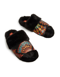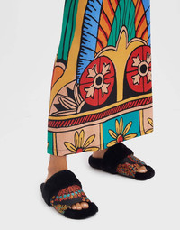 When your outfit says sunshine and the forecast says the opposite, enter the Winter Slides. With buckets of sunny personality, these babies are splashed with our vibration-raising silk jacquard in Egypt-inspired prints and lined with faux fur for extra mmmm factor that’ll last through winter. Totally fancy enough to swap out your stilettos and wear with a printed dress and black tights for date night. Great for your morning schlep to the yoga studio over your jazziest socks, too. Whatever the weather, that extra thick tread will raise you above it. Details & Fit - Jacquard upper - Faux fur trim and lining on sole - Thick tread - Composition: 93% Polyester 4% Silk 3% Nylon