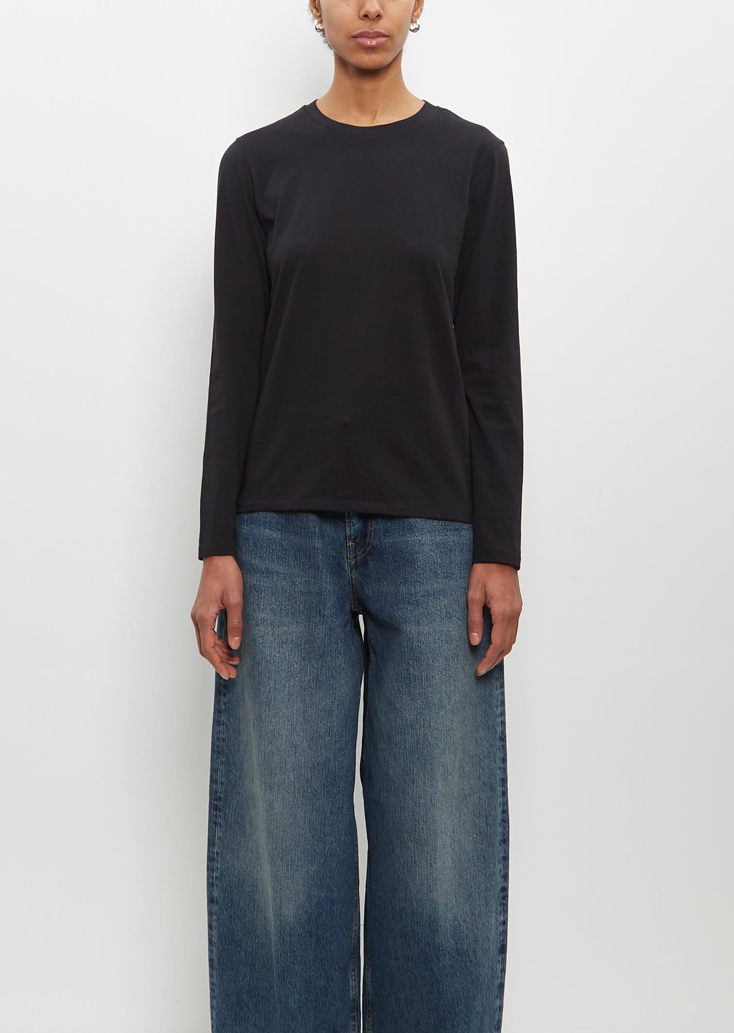 6397 jet black signature long sleeve tee with a round neck in soft pima cotton jersey. Straight cut with a relaxed fit. Also available in: Optic White . Worn with: Stretch Virgin Wool Slim Pull On Pant and City Flip Flop . Sizing: Universal (XS-L). Emily is 5’9.5” (177cm), bust 32", waist 24", hips 35" and wears a size small. Color: Jet Black. 100% Cotton. Imported. SS2563003