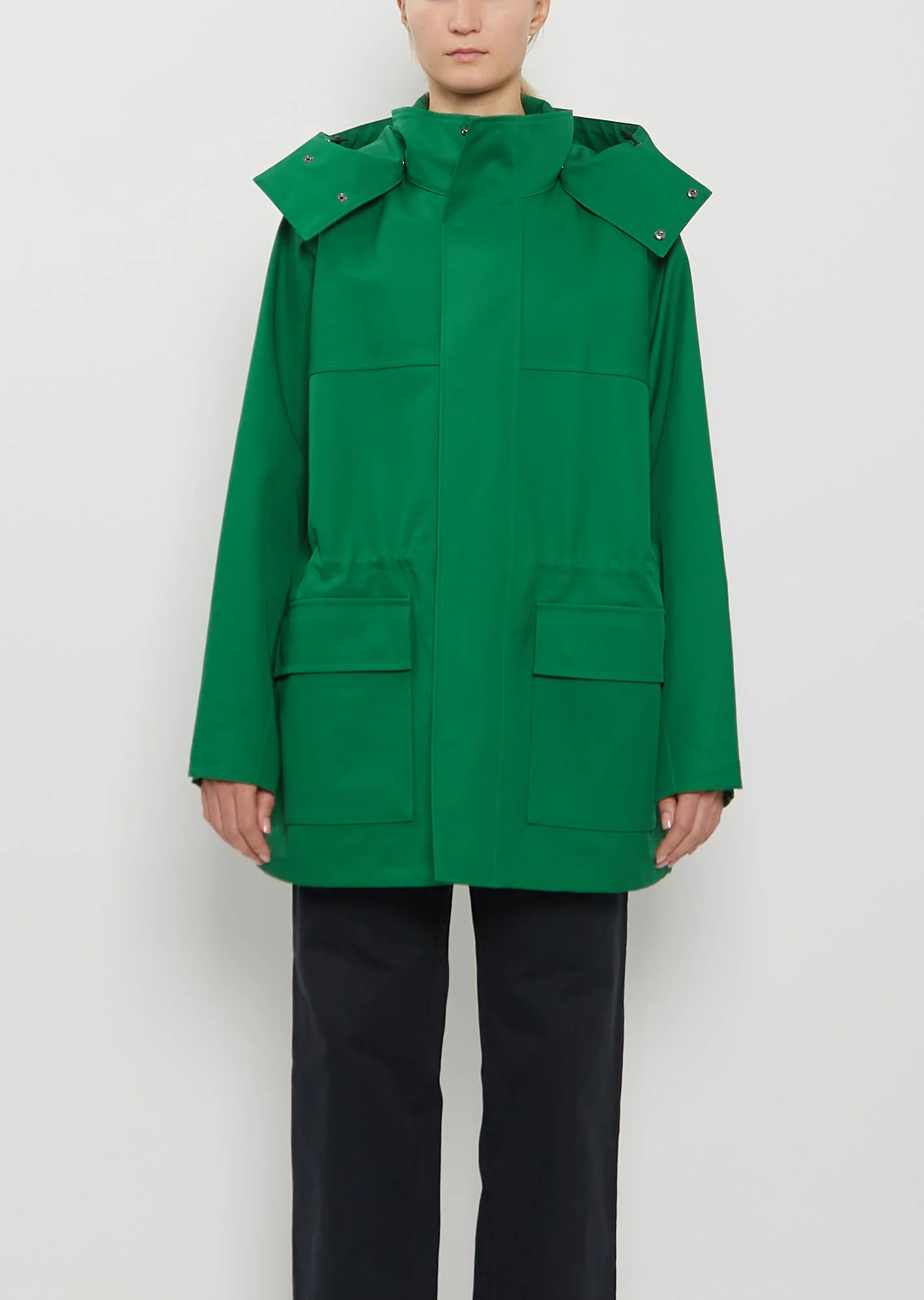Auralee green paneled jacket with a detachable hood and deep press buttoned flap pockets in dense and lightweight cotton gabardine with bonded sides. Features an adjustable drawstring at waist, buttoned cuffs and concealed zipper and snap buttons closure at front. Oversized fit. Comes unlined. Also available in: Dark Navy . Sizing: Designer's unique sizing (0-3). 0=XS, 1=S, 2=M, 3=L. Alina is 5' 9” (175cm), bust 31”, waist 23", hips 34” and wears a size 1. Color: Green. 100% Cotton. Made in Japan. FW25AU028