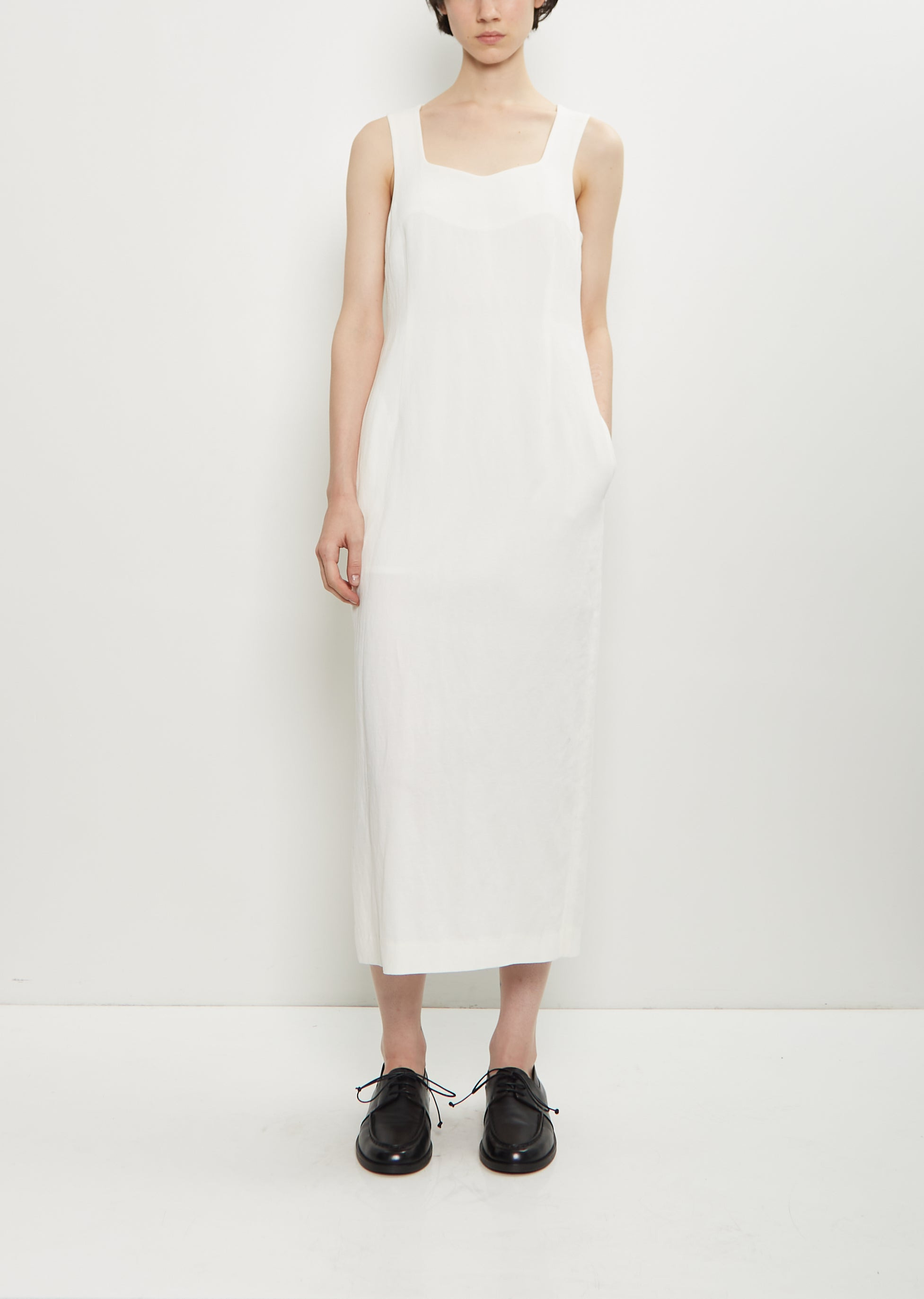 Auralee white straight dress with a subtle sweetheart neckline in a cotton linen gabardine twill. Features side seam pockets, high slit at back, and zipper closure at back neck. Half lined in tonal cotton fabric. Also available in: Black . Worn with: Leather Thong Sandals . Sizing: Designer's unique sizing (0-3). 0=XS, 1=S, 2=M, 3=L. Kate is 5'10” (178cm), bust 30”, waist 23.5”, hips 34” and wears a size 0. Color: White. 60% Cotton, 40% Linen. Made in Japan. PF25AU010