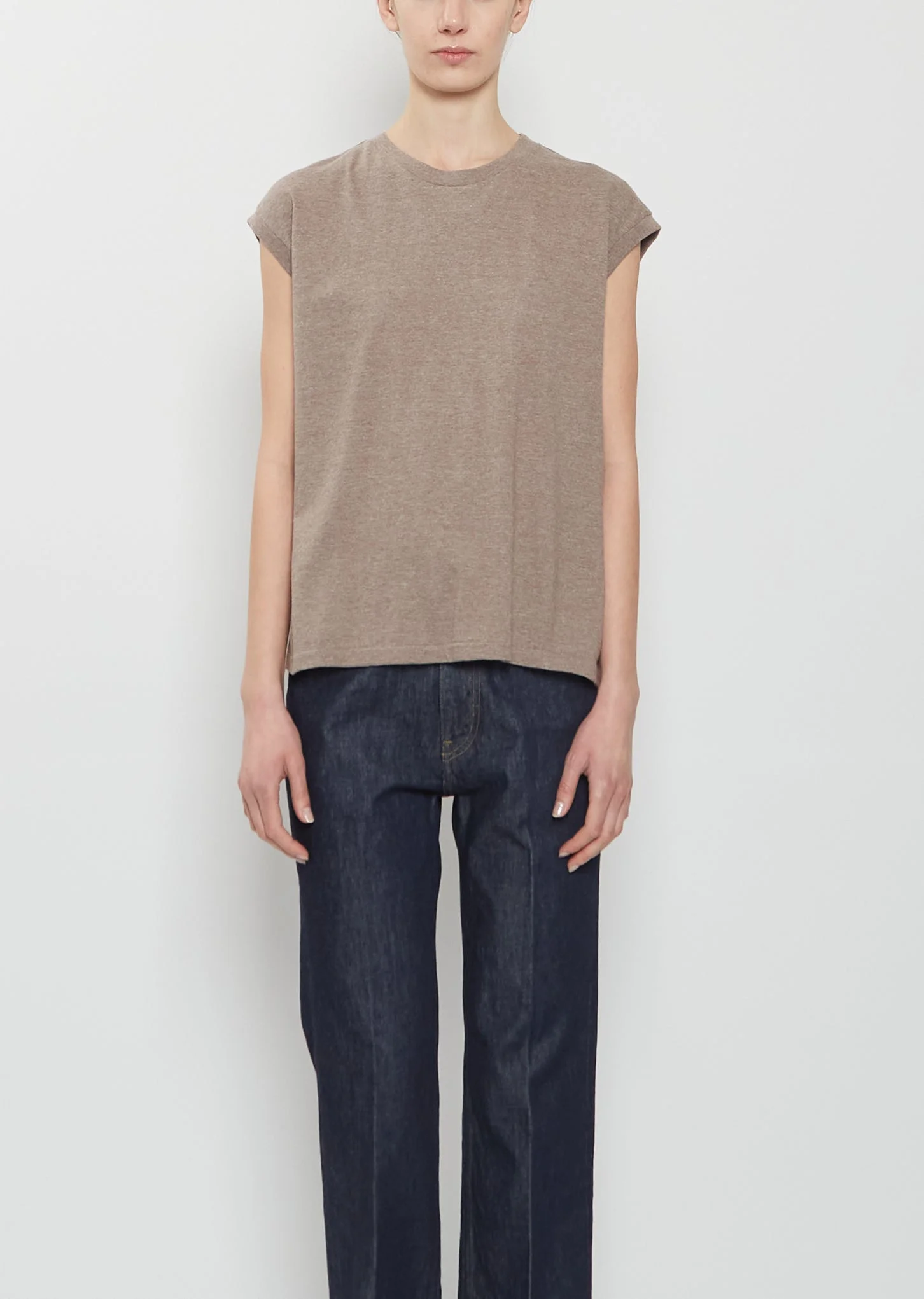 Auralee light brown sleeveless top with a crew neck in a seamless and soft extra-long staple cotton jersey with exceptionally long fibers and a natural sheen. Regular fit. Worn with: Hard Twist Denim 5P Pants and Novus Sailor Shoe — Black . Sizing: Designer’s unique sizing (0-3). 0=XS, 1=S, 2=M, 3=L. Color: Top Brown. 100% Cotton. Made in Japan. SS26AU006