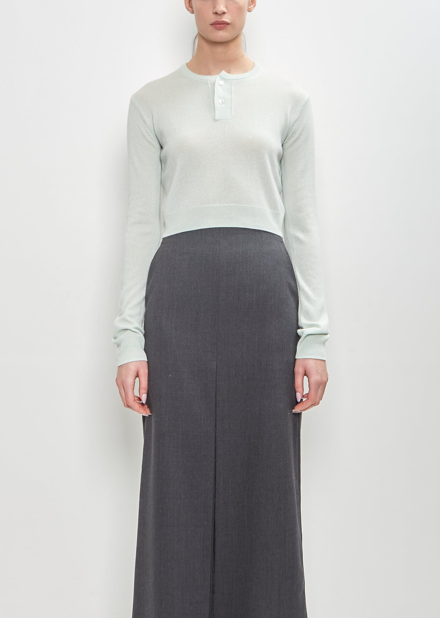 Auralee light green cropped pullover henley with a two black buttons closure in smooth cashmere and silk knit. Features ribbed trim finish at neckline, placket, cuffs, and hem. Regular fit. Also available in: Top Gray . Sizing: Designer's unique sizing (0-3). 0=XS, 1=S, 2=M, 3=L. Color: White Green. 50% Cashmere, 50% Silk. Made in Japan. SS25AU014
