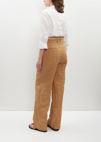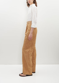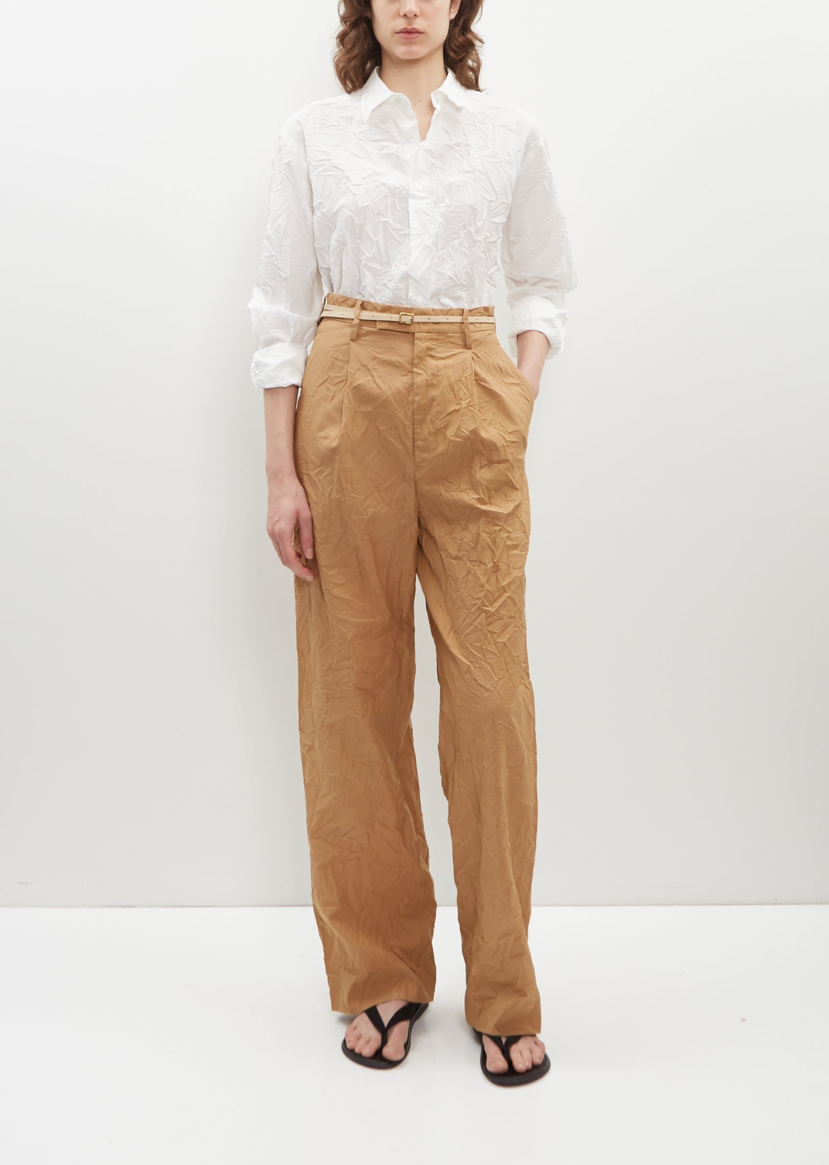 Auralee pleated trouser with wide, straight legs in crinkled washed cotton twill. Features slash side pockets and back welt pockets. Detailed with belt loops. Tab waist with zip fly fastening. Sizing: Designer's unique sizing (0-3W). 0=XS, 1=S, 2=M, 3W=L. Beatriz is 5’9” (175cm), bust 32”, waist 24”, hips 35” and wears a size 1. Color: Brown. 100% Cotton. Made in Japan. PF24AU011