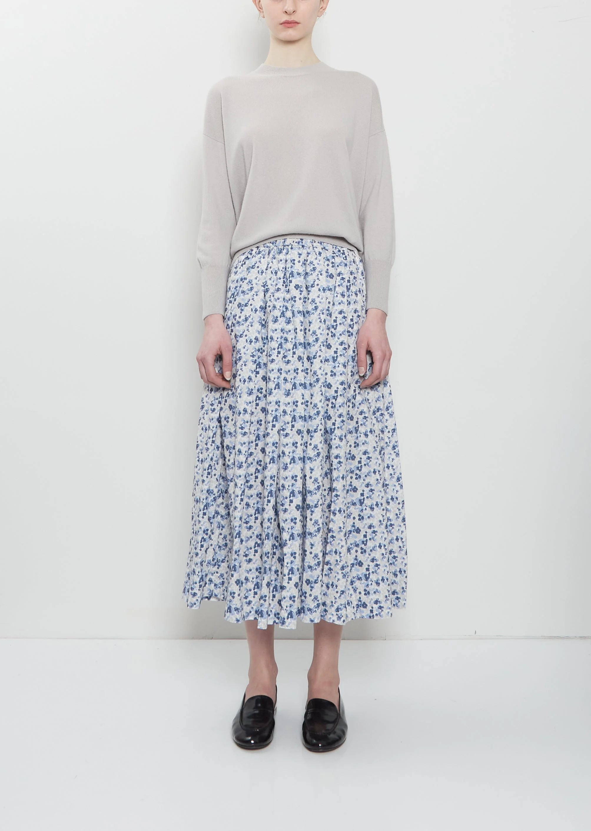 Bergfabel blue and white flower A-line skirt with elasticated waist and interior drawstring in cotton. Features knife pleats at front and back waist and a single side seam pocket. Worn with: Wool Cashmere Sweater and Mandolo Mocassino Patent Loafer Sizing: Italian (38-44). 38=XS, 40=S, 42=M, 44=L. Violet is 5' 11” (180 cm), bust 32.5”, waist 23.5”, hips 35” and wearing a size 40. Color: Disty. 100% Cotton. Made in Italy. PS26BF031