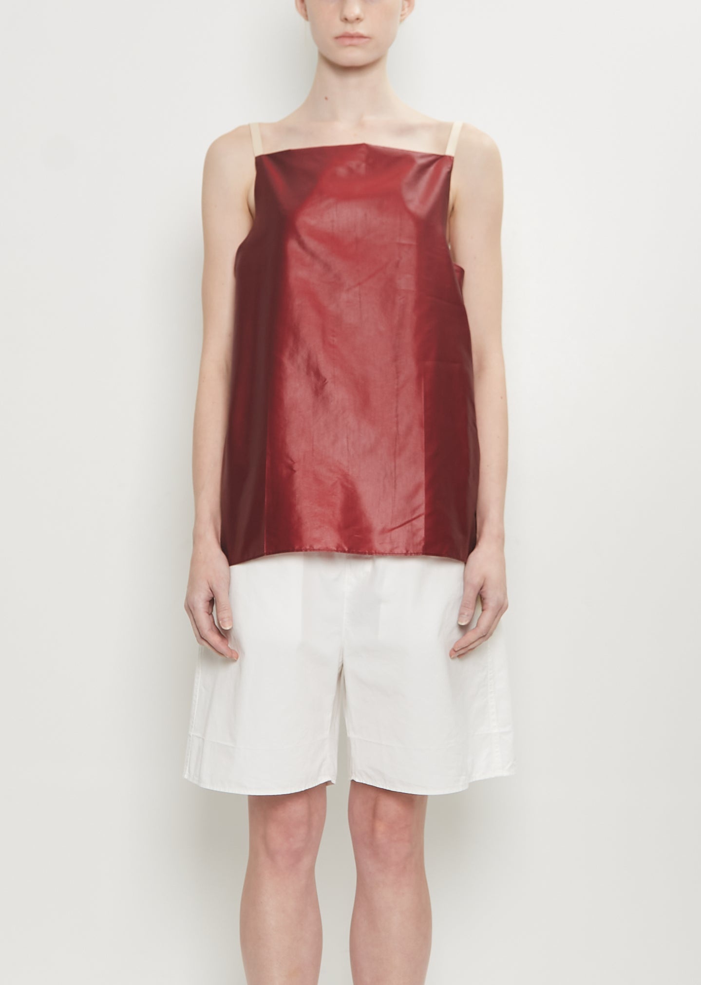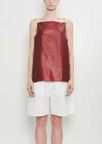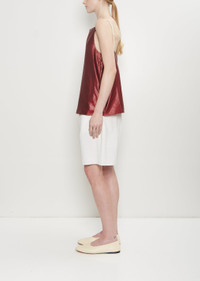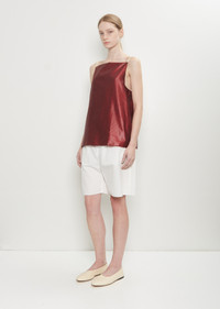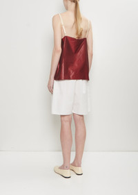 Carven ruby red vest top with a straight neckline and pale pink adjustable lingerie straps in smooth pressed silk. Relaxed fit. Comes unlined. Also available in: White . Worn with: Matt Poplin Pull On Shorts and Awar Flat — Toile . Sizing: French sizing (34-42). 34=XS, 36=S, 38=M, 40=L, 42=XL. Hayley is 5’10” (178cm), bust 31", waist 23.5", hips 34.5" and wears a size 36. Color: Ruby. 71% Polyester, 29% Silk. Imported. SS25CA008