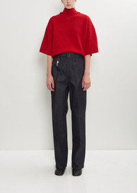 Carven washed jeans with straight legs and crease details in dense Japanese selvedge denim. Features belt loops, 5-pocket construction, a gold-toned key charm and baroque pearl detail at waist, and button, hook and eye zipper fastening. Relaxed fit. Worn with: Wool Cashmere Scarf Top and Nappa Leather Flats . Sizing: European (34-38). 34=XS, 36=S, 38=M, 40=L. Audrey is 5'11” (180cm), bust 32”, waist 24”, hips 35” and wears a size 36. Color: Washed Denim. 100% Cotton. Made in Japan. PF25CA012