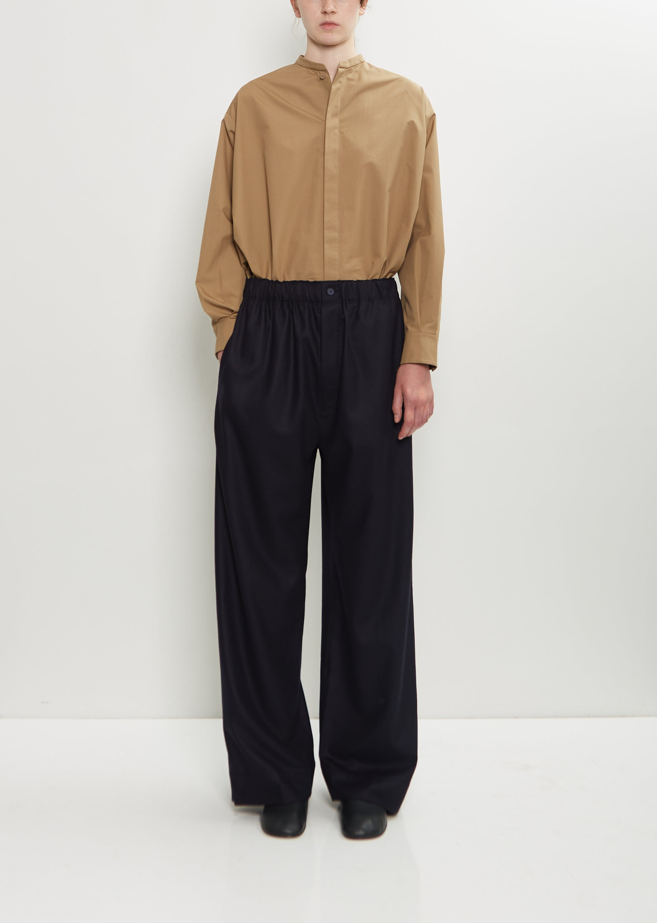 Carven midnight blue pull-on trouser with wide, straight legs in soft virgin wool. Features an elasticated waistline with interior adjustable button tab belt, side seam pockets, a single patch pocket at back, and a tonal button-fly fastening. Worn with: Cotton Bow Shirt and Nappa Leather Flats . Sizing: European (34-38). 34=XS, 36=S, 38=M, 40=L. Audrey is 5'11” (180cm), bust 32”, waist 24”, hips 35” and wears a size 36. Color: Midnight. 100% Virgin Wool. Lining: 100% Cotton. Imported. PF25CA010