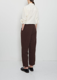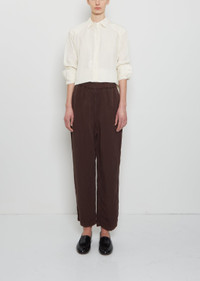 Casey Casey brown signature pull-on trouser with tapered legs in lightweight and breathable linen and lyocell blend twill with a washed effect and garment-dyed finish. Features an elasticated waist with interior adjustable drawstring, angled side pockets and a single patch pocket at back. Easy, pull-on fit. Also available in: Blue. Worn with: Days Travail Cotton Shirt — Off White and Mandolo Mocassino Patent Loafer . Sizing: Universal (XS-L). Color: Brown. 54% Lyocell, 46% Linen. Made in France. PS26CC013