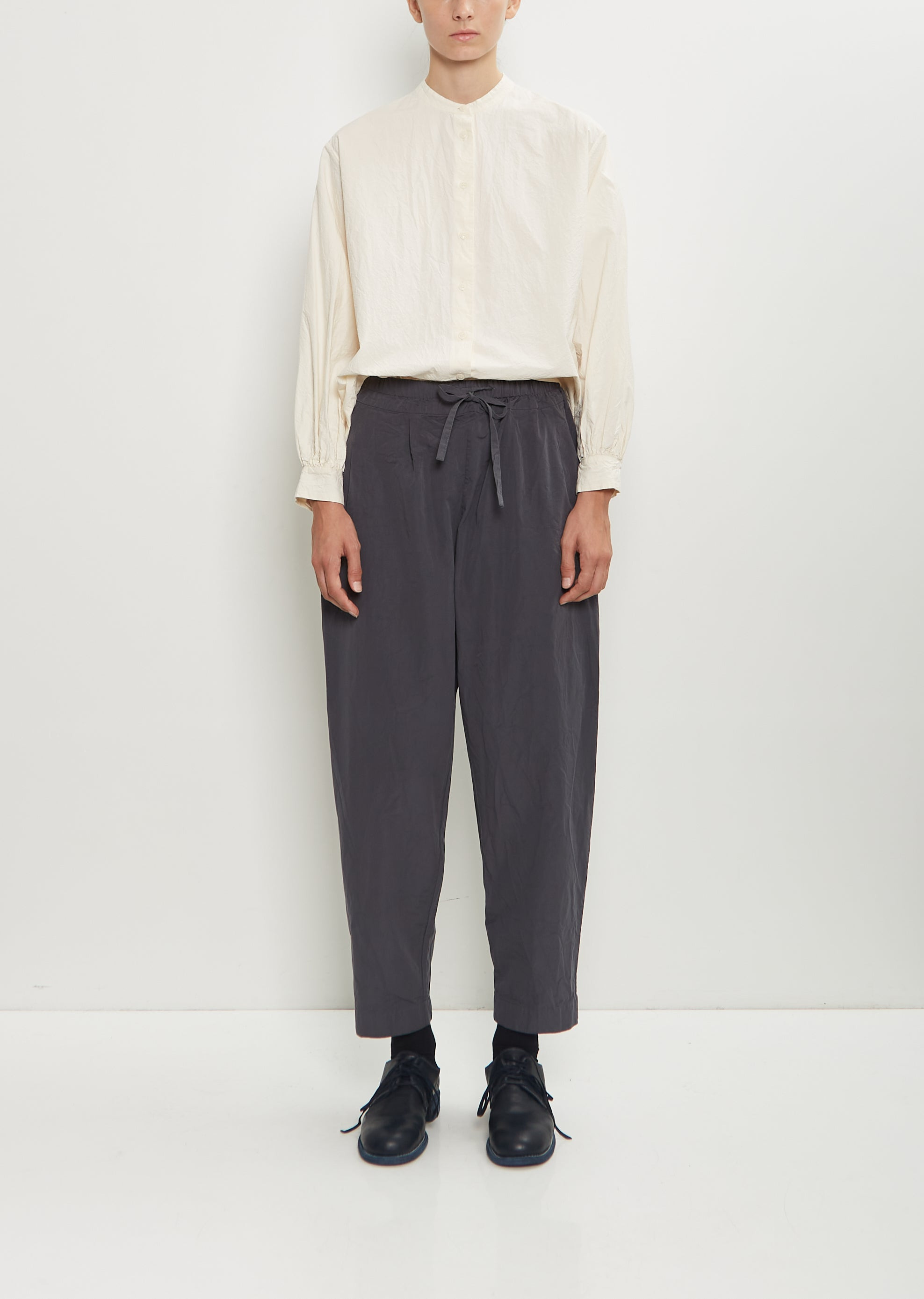 Casey Casey blue signature pull-on tapered pant with pleats at front and an elasticated waist in lightweight and breathable cotton. Features an adjustable drawstring at waist and side seam pockets. Relaxed fit. Sizing: Universal (XS-L). Amelia is 5' 10.5” (179cm), bust 32”, waist 24”, hips 35” and wears a size small. Color: Blu Skull. 100% Cotton. Made in Portugal. PF25CC012