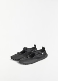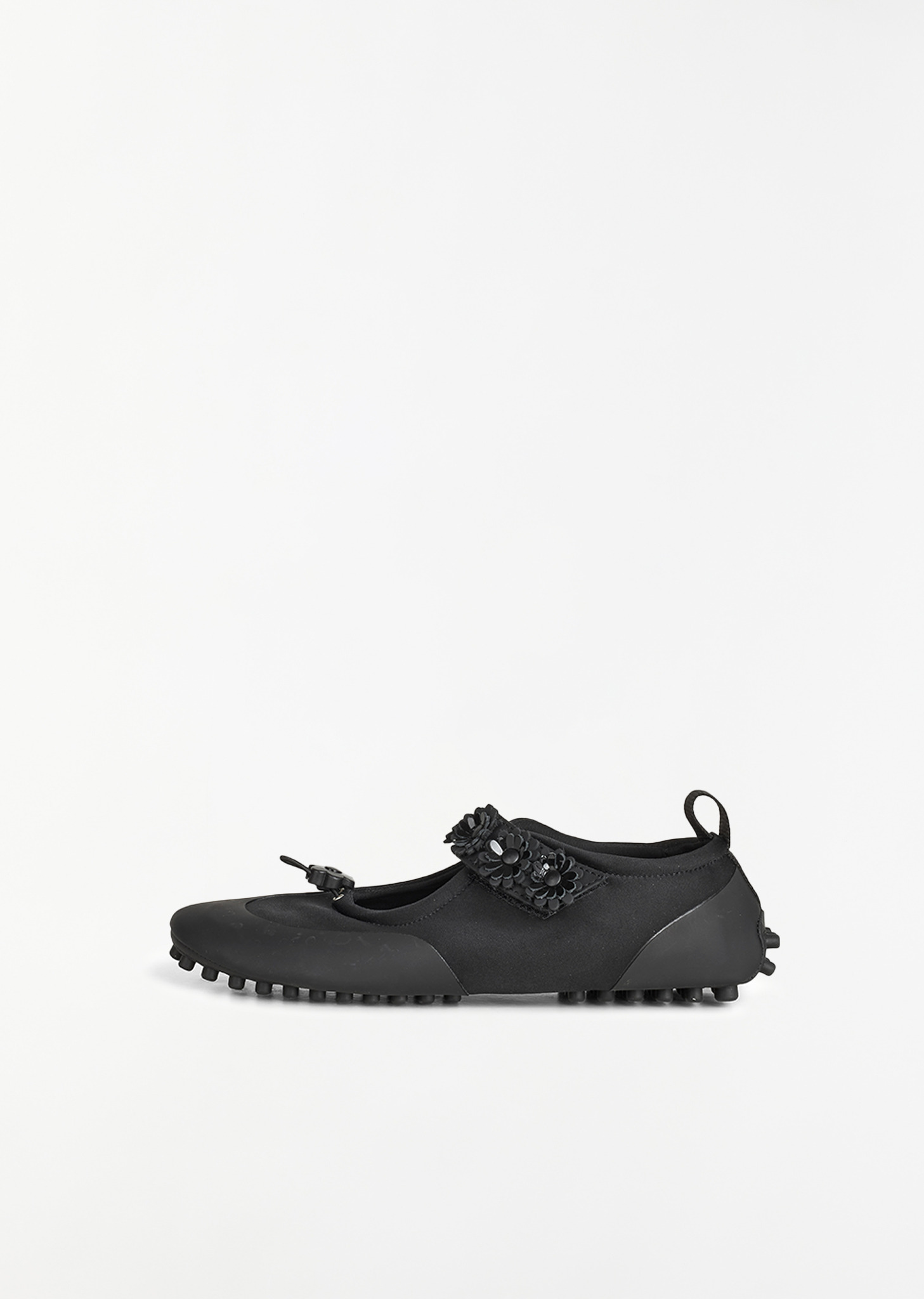 Cecilie Bahnsen black mary jane flat with a velcro leather strap adorned with flower appliques and an adjustable flower motif drawcord in neoprene. Features an almond toe, pull tab at back, leather panels at back and toe, and a leather sole with rubber pebbles. Sizing: European (36-41). Color: Black. 100% Neoprene. Imported. PF25CB001