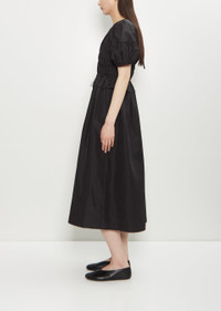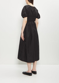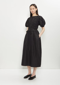 Cecilie Bahnsen black A-line dress with a ruched bodice and peplum waist detail in a lightweight recycled faille. Features a round neckline, ruching details along shoulders, short puff sleeves, an elastic drawcord waist detail with a floral motif, side seam pockets, and a tie closure at back neck . Also available in: Olive . Worn with: Stella Leather Slipper — Black . Sizing: UK (6-12). 6=XS, 8=S, 10=M, 12=L. Effy is 5'10” (178cm), bust 30.5”, waist 23”, hips 33” and wears a size 8. Color: Black. 100% Recycled Polyester. Imported. PF25CB007