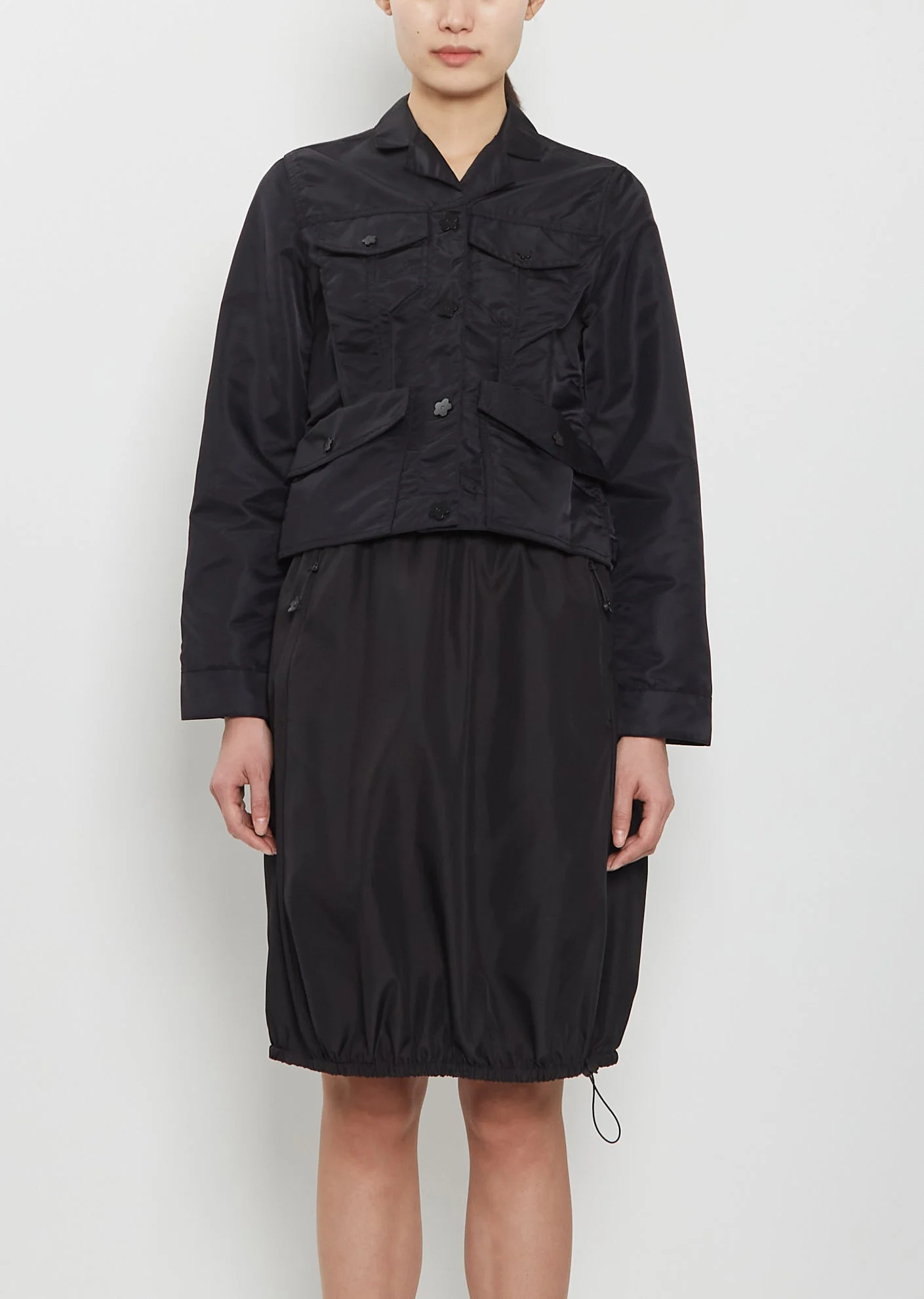 Cecilie Bahnsen black tailored blazer with a small notched collar and four buttoned flap pockets at front in technical nylon. Features ruched details throughout, side tabs and snap buttons closure at front. Comes unlined. Sizing: UK (6-12). 6=XS, 8=S, 10=M, 12=L. Xian is 5' 9.5” (177cm), bust 30.5”, waist 23”, hips 34.5” and wears a size 8. Color: Black. 100% Recycled Polyamide. Imported. PS26CB012